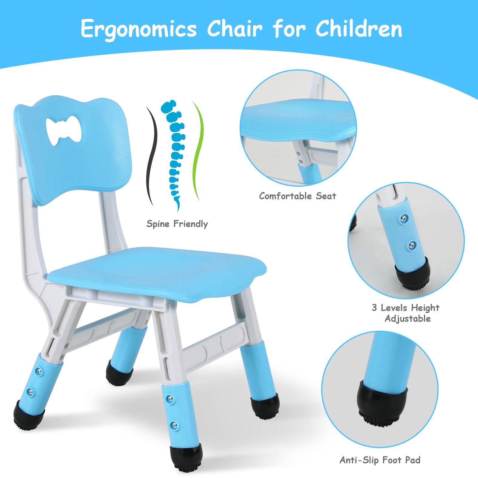 The table has five height levels ranging from 18.9 to 23.6 inches(7 level) , while the chairs have three levels ranging from 20.8 to 22.4 inches(3 level). STURDY CONSTUCTION: Kids Study Table and Chair Set is made of HDPE plastic. Table has a maximum weight capacity of 222 lbs, while the chairs can support up to 180 lbs lbs bedroom, or learning area.