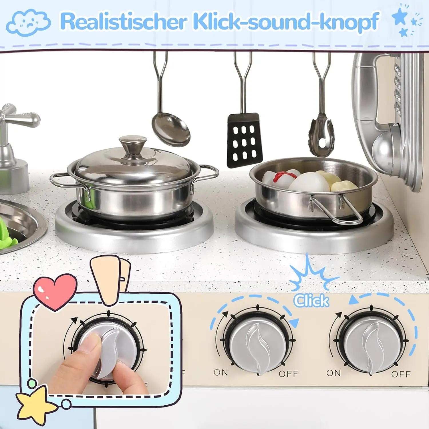 This play kitchen set comes with detailed instructions, easy to assemble. Rounded polished corners and smooth surface make it safe and easy to clean. This kitchen pretend toy is made of high-quality MDF, durable. It has a sturdy frame and an environmentally friendly paint finish that is free of harmful substances like BPA, PVC, phthalates, lead, latex, and formaldehyde. It includes the stainless steel pot and utensils. Other toys displayed on pics like egg, bread, fruits ARE NOT INCLUDED
